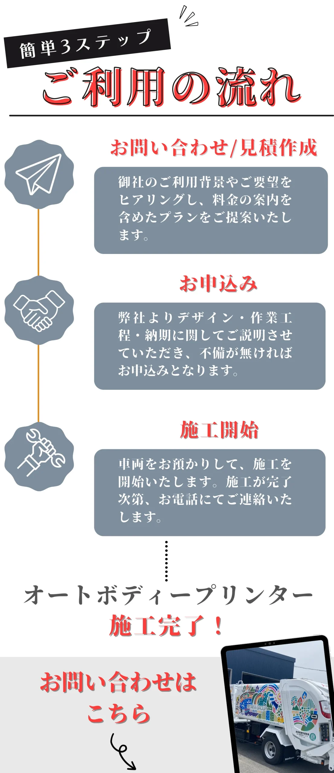 独自のインクジェット塗装技術を用いて、大型車のボディや様々な素材(凹凸、湾曲面)へ直接印刷できる画期的なシステムです。